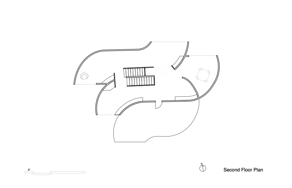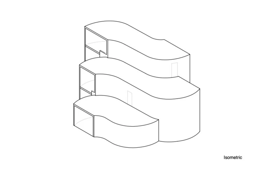 Intended to be used as a cafe and study space, this building’s design is guided by the interaction between three forms. These parts flow with one another until the spaces come to staggering, orthogonal ends. The terminations illuminate the flowing space within the building and reveal the interaction between the wall and floor planes. The facade is uniform and smooth, breaking only when it is cut by the windows, where the openings are indented at the overlaps to reinforce the relationship of the aggregated, intersecting parts.